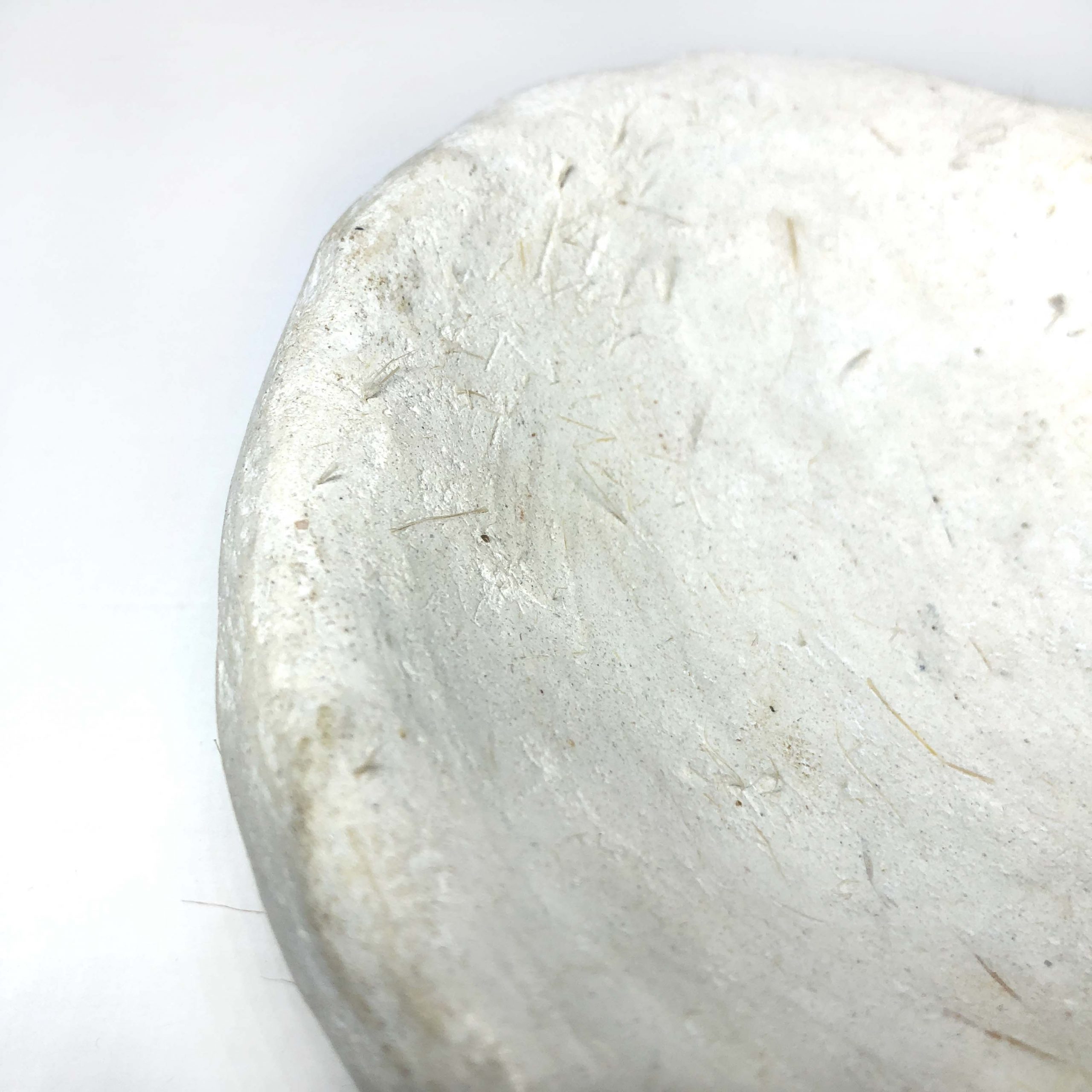 Coupelle en chaux et chanvre modelé avec surface stuc et fibre de chanvre visible.