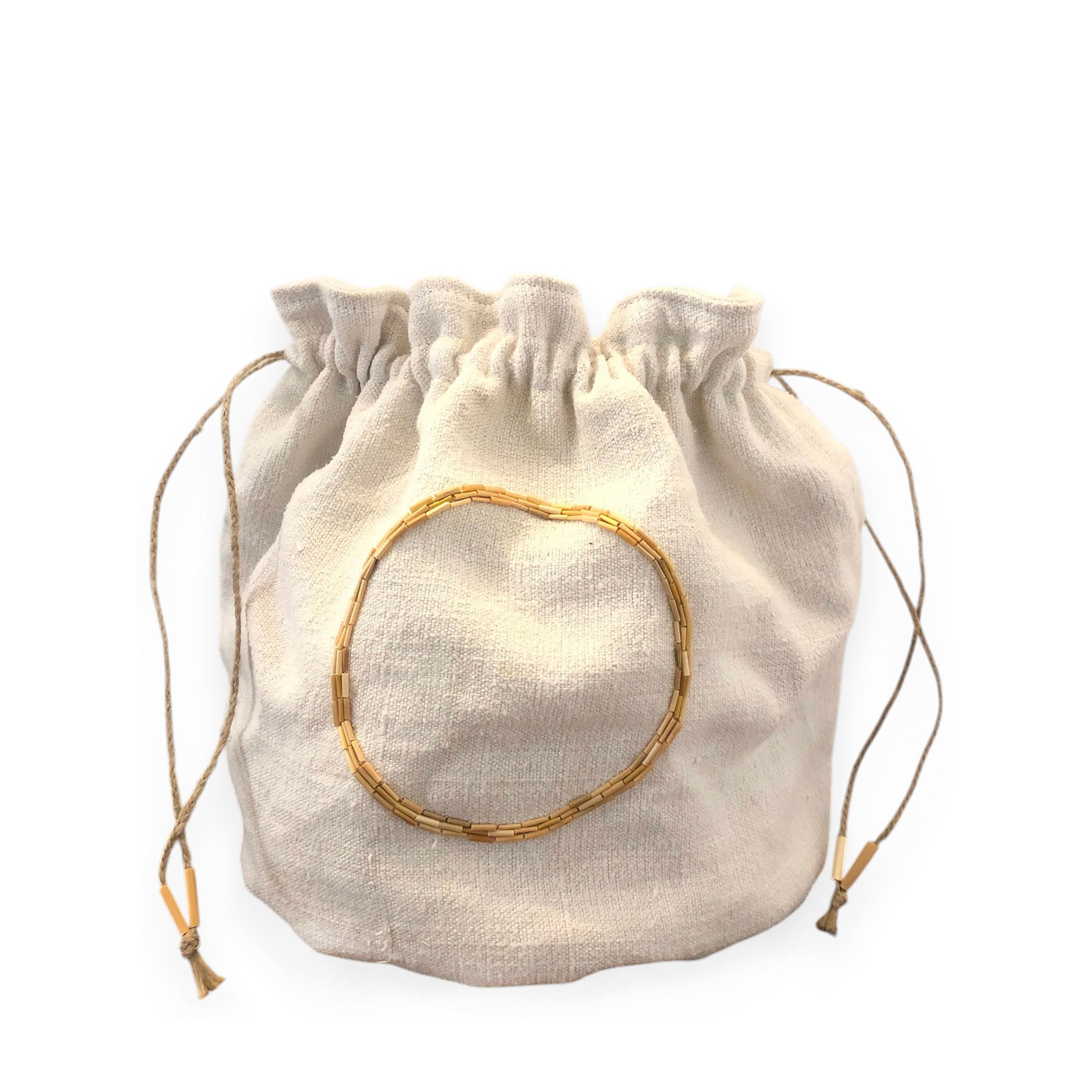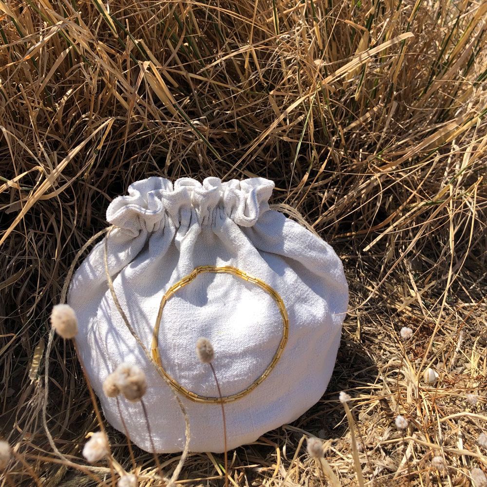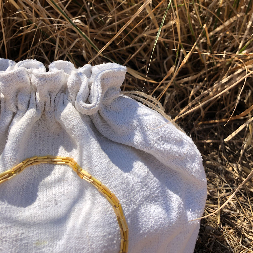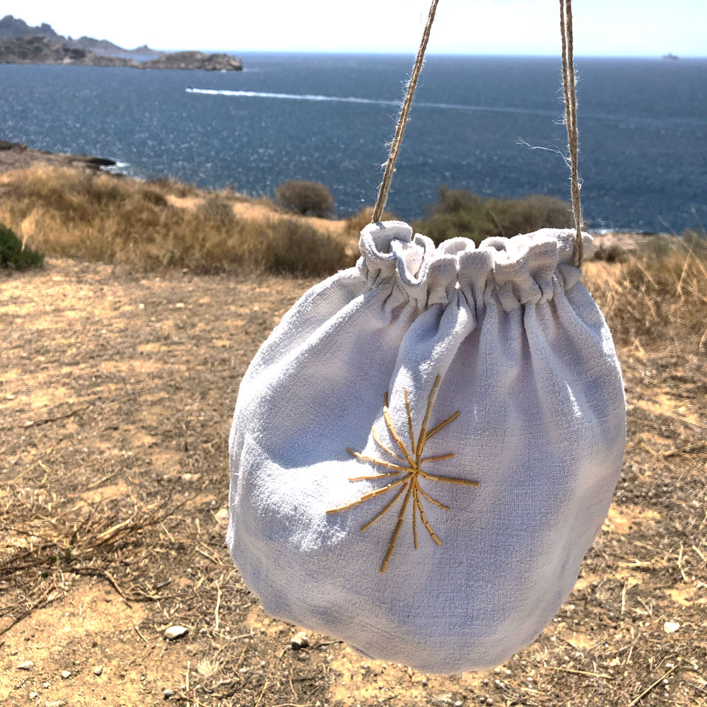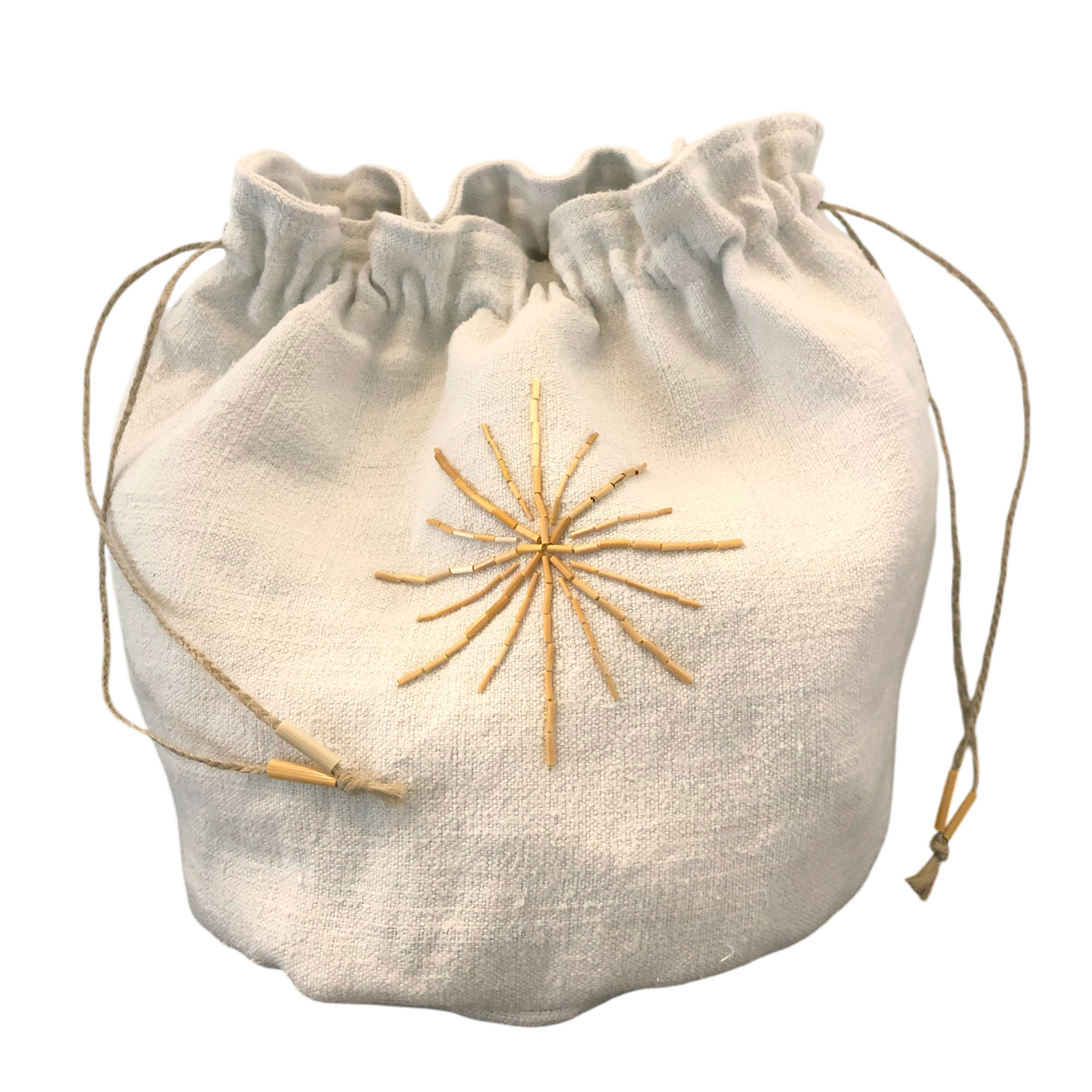 Solilune est réalisé en drap ancien de lin brodé avec de la paille, il peut contenir des cendres pour une dispersion rituelle ou accueillir des souvenirs du défunt. Sur une face, une étoile solaire est brodée en paille, or naturel, symbole de lumière et de vie. Sur l’autre, un médaillon évoquant une pleine lune peut accueillir le nom ou un message adressé au disparu, brodé ou imprimé par ses proches.